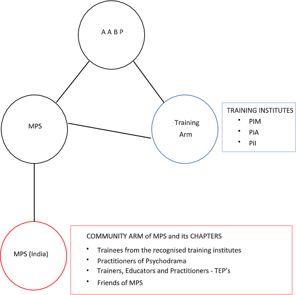 The PiI and MPS (India) journey began when some of us from the Maanas Team visited Melbourne in October 2018 and shared with the AABP our desire to grow psychodrama within India. This desire had been ignited through attending annual workshops in India, conducted by Sue Daniel (Founder of AABP), and through these experiences we not only fell in love with psychodrama, but saw its endless possibilities for healing and the development of mutual positive relationships that have benefit across our society. Meetings and discussions happened over 2 days and many hours with the Board members hearing out the vision we had for Psychodrama, and then inviting us to set it out in action. They generously agreed to support this social enterprise and provide all kinds of training, guidance, and the necessary supervision for developing this great approach within India in a systematic manner. Through these discussions two bodies emerged. The first one was the MPS (India) which would be under the umbrella organisation MPS (see diagram 1 below) to carry out the larger goals of MPS within India. It also ensured that the Psychodramatists getting accredited from PiI would maintain their membership and to keep developing themselves both personally and professionally.